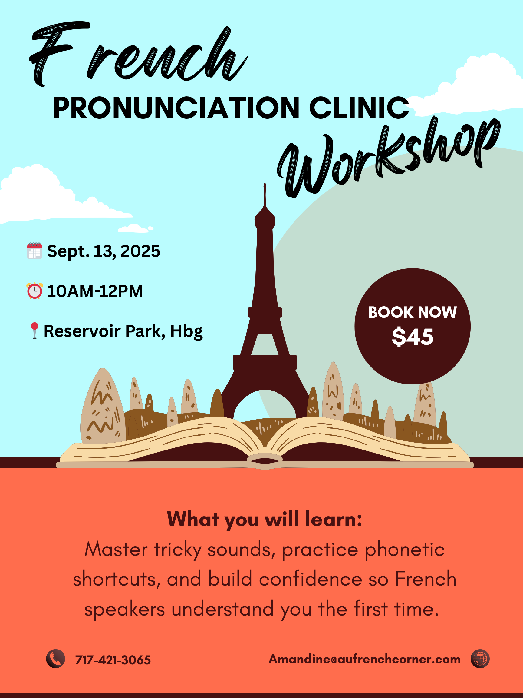 Master the sounds that make French unique! In this 2-hour interactive workshop, you'll practice tricky pronunciations, learn phonetic shortcuts and gain confidence speaking French. Perfect for beginners and travelers alike.